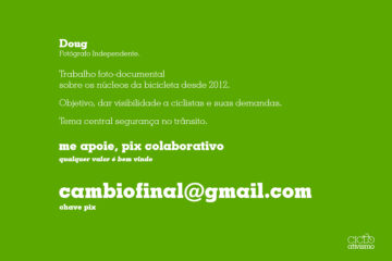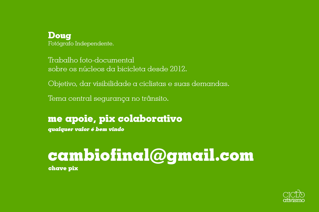 Trabalho foto-documental sobre os núcleos da bicicleta em Curitiba desde 2012. Tema central segurança no trânsito. Tem como objetivo dar visibilidade a ciclistas e suas demandas. Utiliza o fotojornalismo como ferramenta de alcance. A intenção é, debater, planejar e atuar na melhoria da infraestrutura viária através da informação.